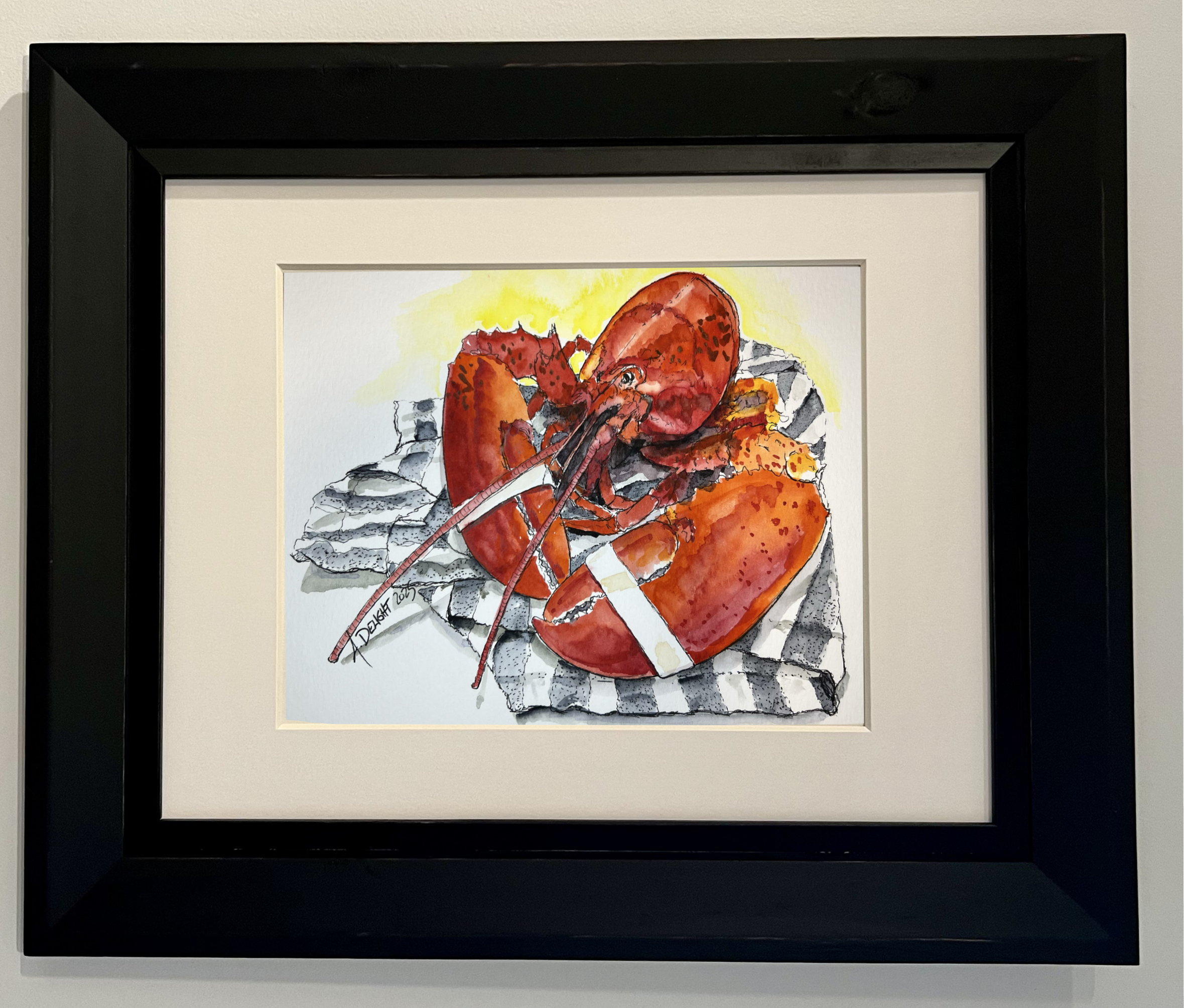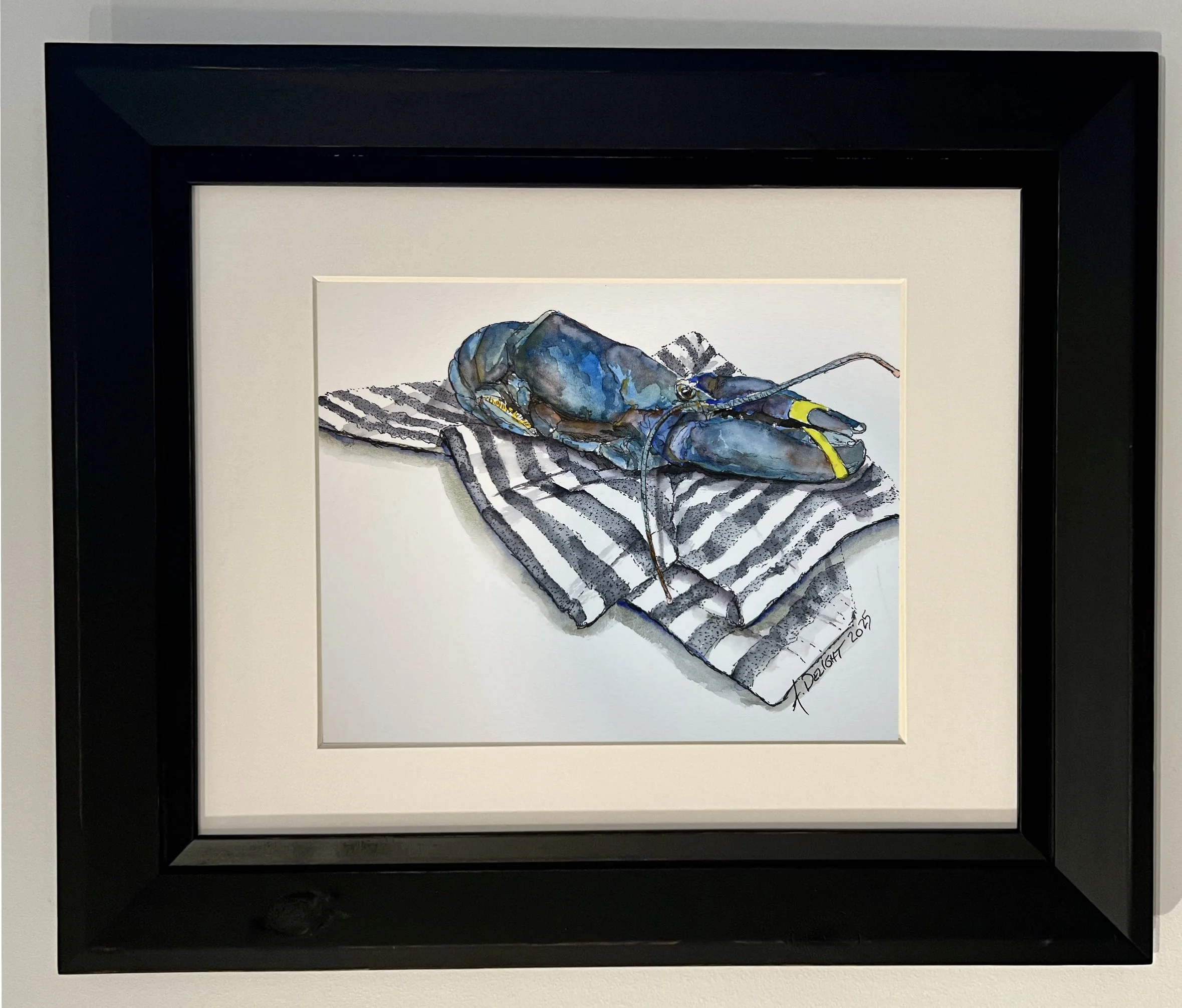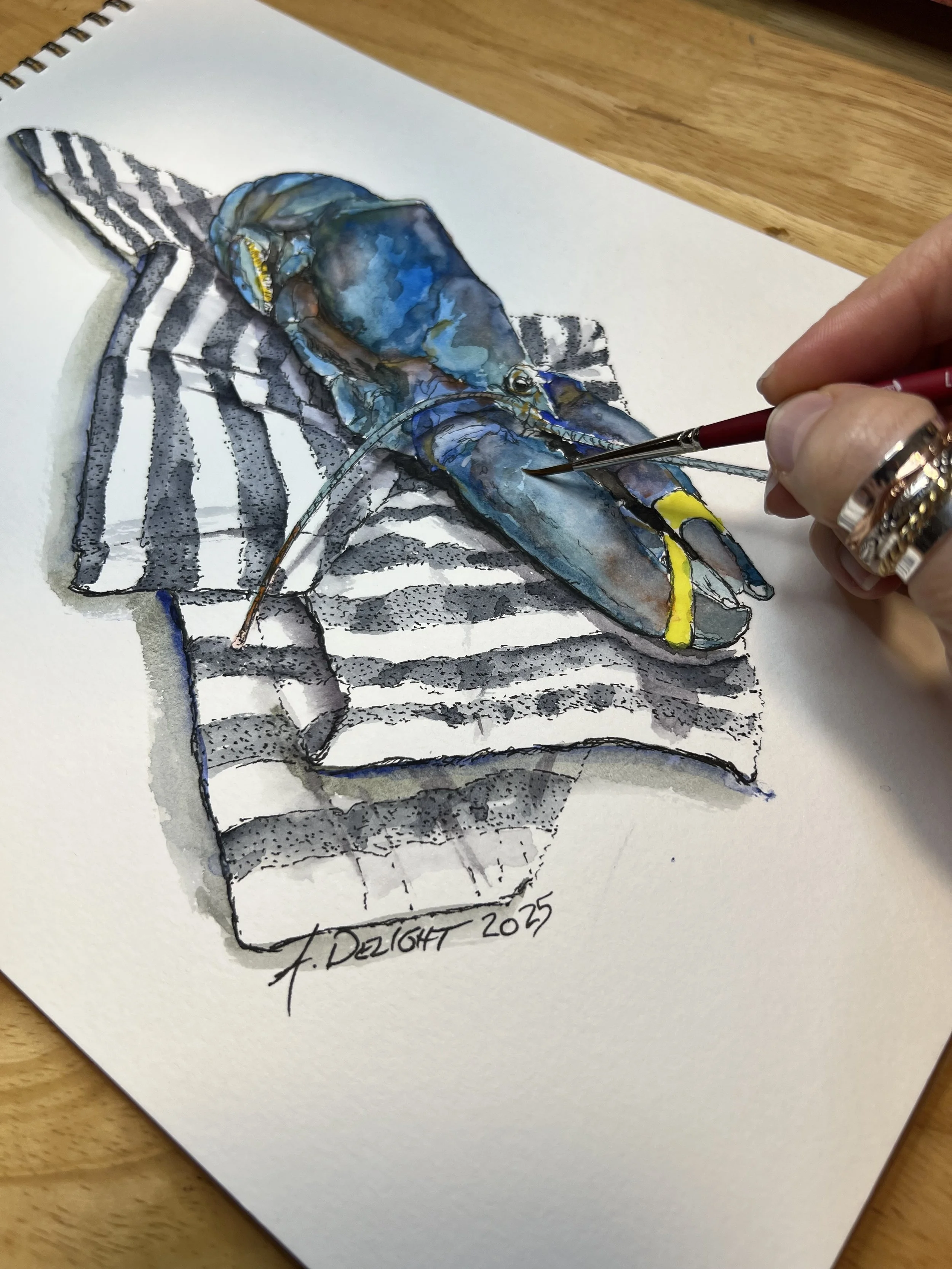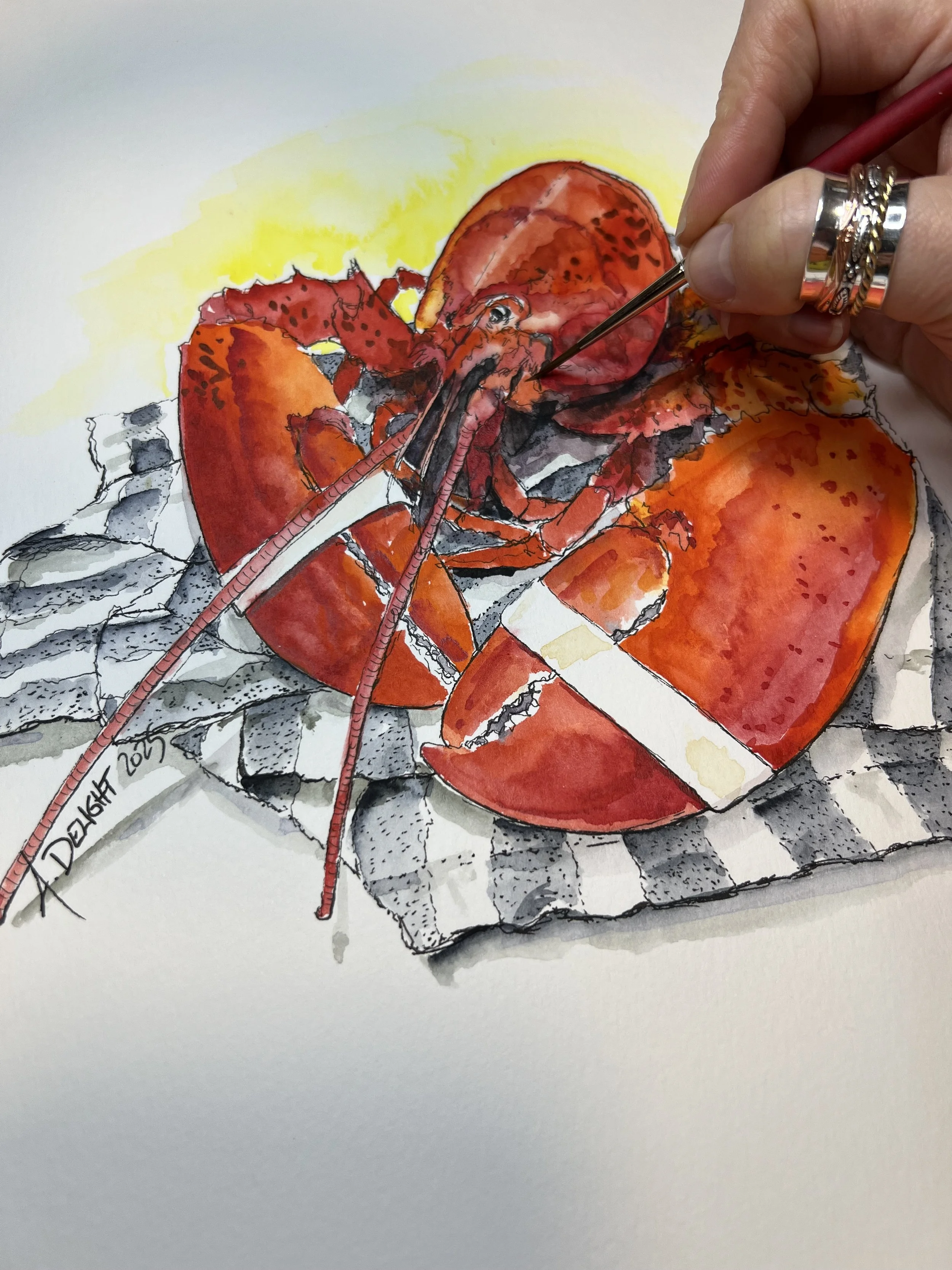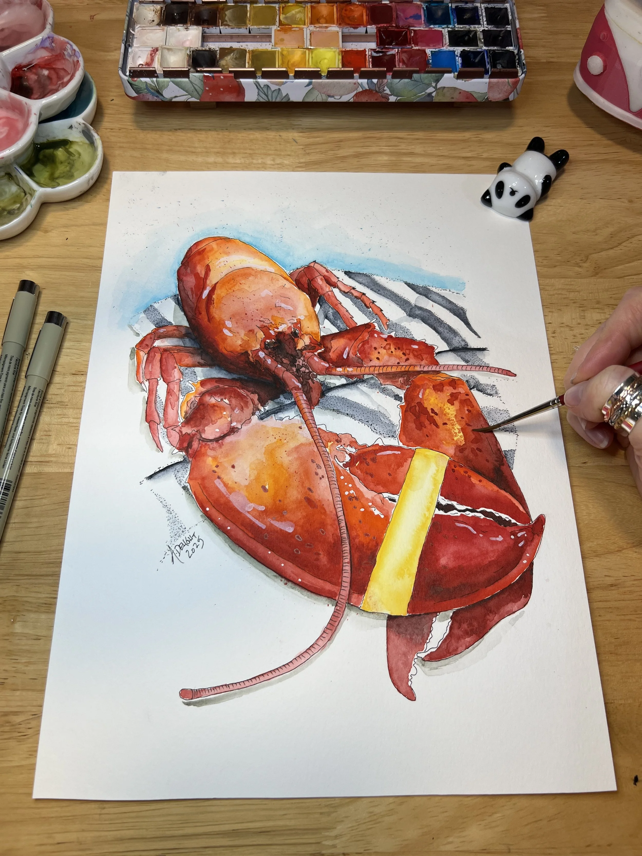 Living on the coast of Maine, Amanda is continually inspired by the textures, rhythms, and quiet strength of coastal life. Her latest watercolor series centers around one of the state’s most iconic creatures: the Maine lobster. More than a symbol of travel and commerce, the lobster embodies a way of life. It is resilient, rooted in tradition, and beautifully singular.